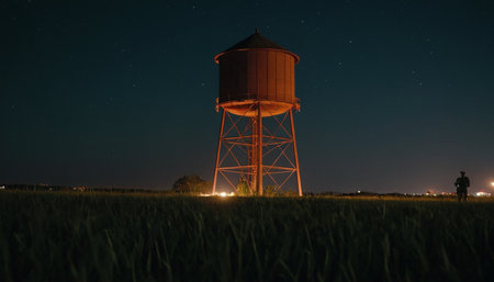 A tall water tower stands against a dark night sky