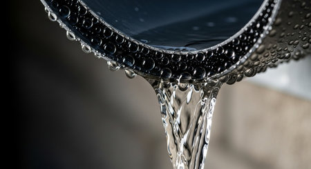 Close up of water flowing from a silver pipe captivating action shot of dripping water