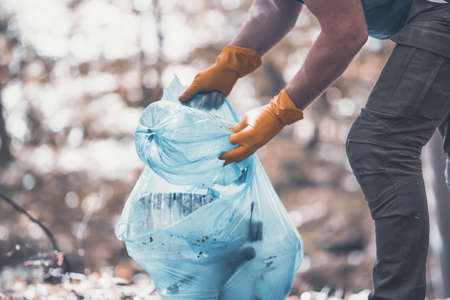 Hand picking up garbage plastic for cleaning the woods or parks. Environmental protection, Earth Day, volunteer concept.