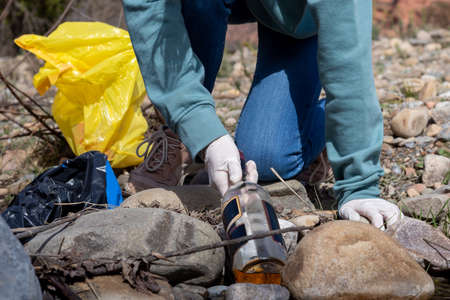 Unrecoginizable woman picking up bottle of alcohol thrown in nature by people