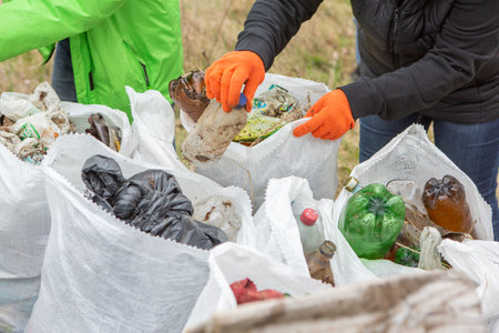 Volunteers are collecting garbage in trash bags, cleaning the environment in nature