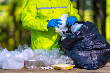 Hands of man putting plastic waste into bag