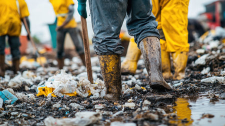 Sanitation workers wearing protective gear are removing trash in a polluted landfill