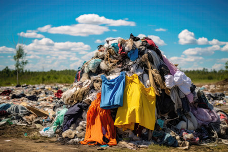 An environmental disaster unfolds in this image, illustrating the devastating impact of textile waste pollution. Rivers and landfills overflow with discarded clothing waste, vividly depicting the consequences of fast fashion and consumerism. The scene portrays a critical environmental problem, highlighting environmental damage caused by improper waste management. This powerful visual is ideal for illustrating articles and presentations on sustainability, climate change, and the crisis facing our environment due to discarded textiles.