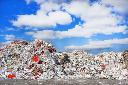 Huge heap of trash at recycling plant under sky with clouds
