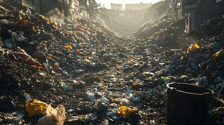 A vast landfill site full of various types of waste, including plastic, clothing, and other debris, highlights pollution and ecological issues.