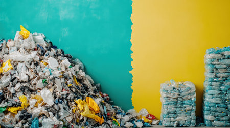 A striking image of a large pile of mixed garbage and waste against a vibrant solid color background, highlighting the critical issues of pollution and recycling challenges in modern society.