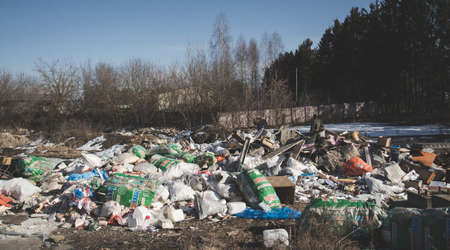Garbage dump with plastic bags and food waste. Recycling of waste on junk yard. Dispose the rubbish in landfill. Trash disposal and rubbish dump with polution. Ecology, refuse and natural resources