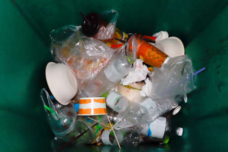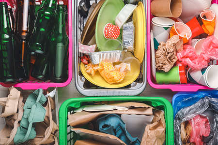 Multicolor separation on waste concept: not separated plastic, metal,organic, mixed waste, paper, closeup