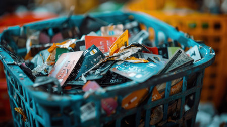 Debt Freedom Symbolized by Torn-Up Credit Cards in Trash Bin.