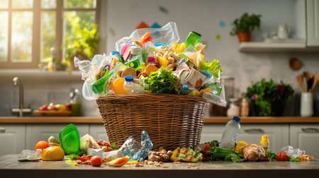 A vibrant kitchen scene showcasing an overflowing basket of plastic waste, surrounded by fresh fruits and vegetables, emphasizing the need for recycling and sustainability.