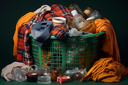 A concrete container filled with colorful mixed waste items highlights the importance of recycling and environmental responsibility. It serves as a visual reminder for sustainable practices.