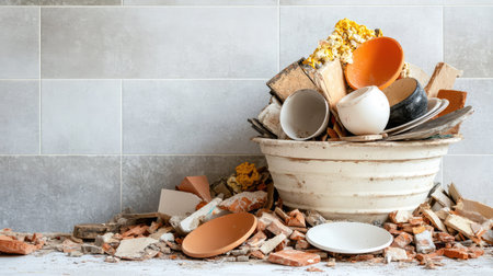A large bowl overflows with various kitchen utensils and debris, creating a chaotic scene on a rustic surface, ideal for home renovation themes.