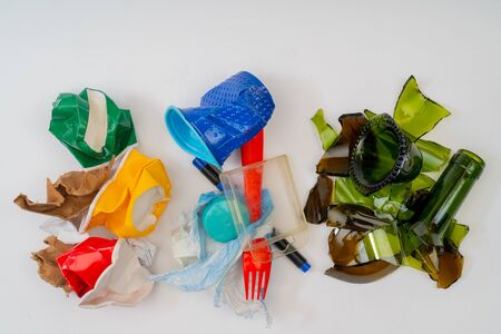 Recyclable waste, resources. Clean glass, paper, plastic and metal on white background. Recycling, reuse, garbage disposal, resources, environment and ecology concept