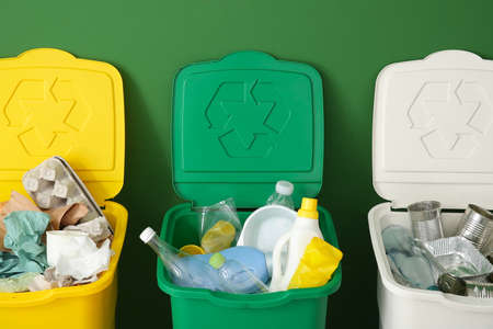 Trash bins and assorted garbage isolated on green, recycle concept, Top view
