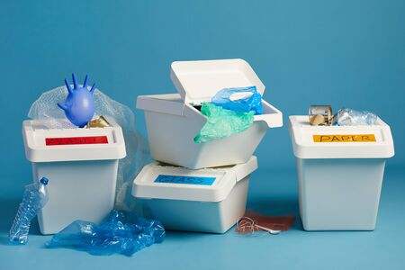 Horizontal image of full trash bins for plastic and paper waste in row against blue background, sorting and recycling concept, copy space