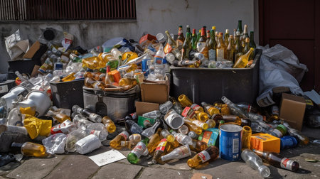dirty from garbage streets littered with broken glass and overflowing garbage, created with generative ai