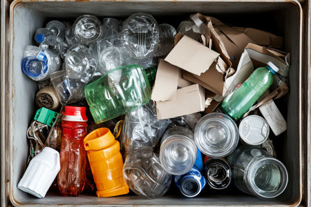 Colorful recycling bin showcases a variety of sorted glass, paper, and plastic materials, promoting eco-friendly habits. This organized collection encourages responsible waste disposal.