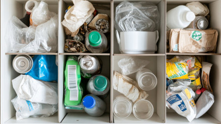 Home recycling drawer with various materials, overhead view, background, AI generated