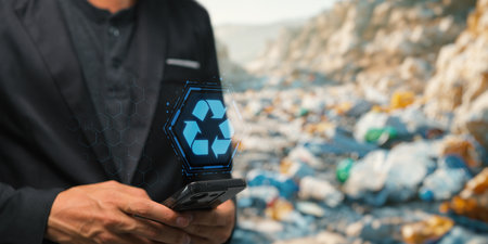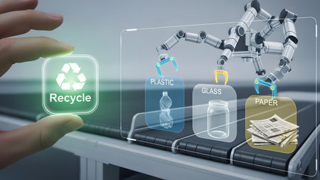 Hand holds recycle icon near a robotic arm sorting plastic, glass, and paper. Clear details and v...