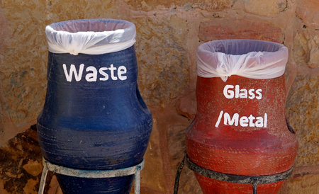 Colorful amphora shaped recycling bins against stone wall in Egypt