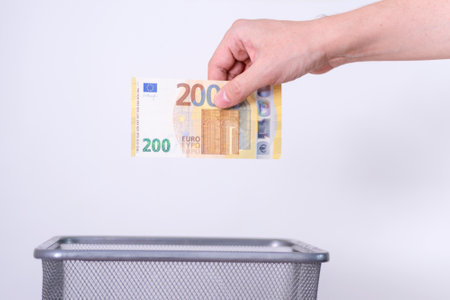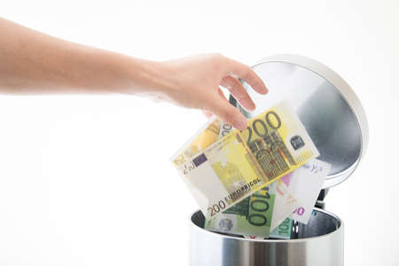 The hand throws two hundred euros in the trash. The concept of the devaluation of the euro.