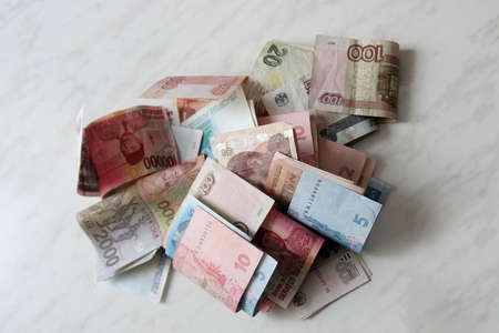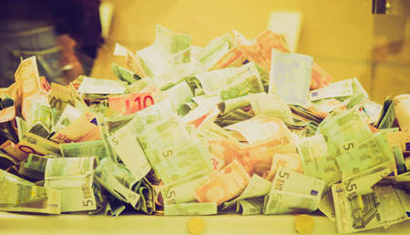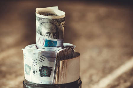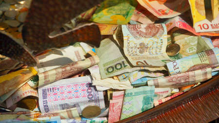 Banknotes thrown into the museum's moneybox, a drop in money from many countries of the world to rebuild monuments. Krakow, Malopolskie, Poland - 03/05/2015