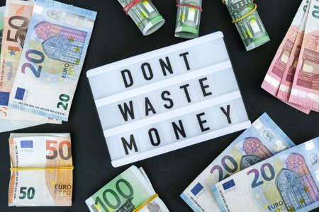 Lightbox board with word DONT WASTE MONEY in black letters around euro banknotes. Money, Business, finance, investment, saving. Cash bill. Business budget of wealth and prosperity finance. Passive income