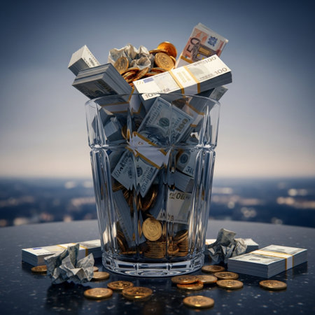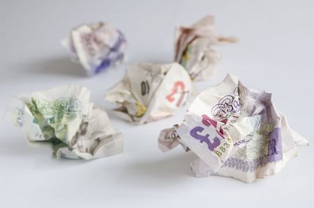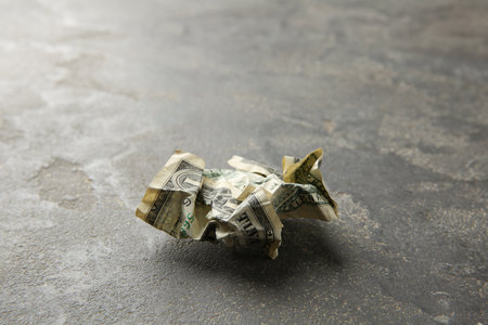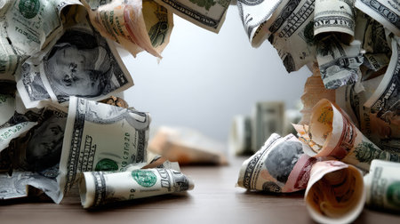 Scattered crumpled banknotes lie on a messy surface, representing wasted money and financial disarray