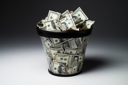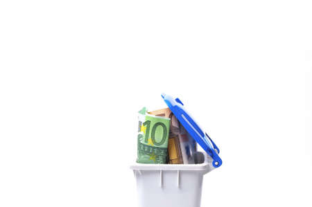 Money glass transparent dustbin isolated on white. Waste inflation economic garbage. Generate Ai