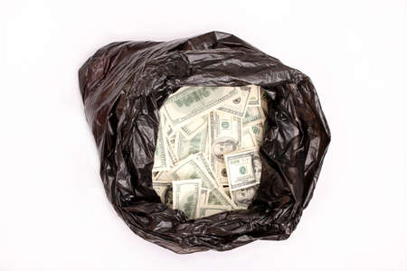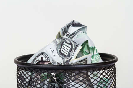 Dollar banknotes crumpled inside garbage basket, rubbish bin focused on consuming money in finance concept, isolated on white background.