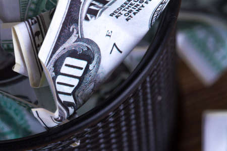 Dollar banknotes crumpled inside garbage basket, rubbish bin focused on consuming money in finance concept, on wooden background.