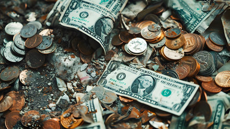 A pile of dollar bills and coins in a post-apocalyptic setting speaking to themes of financial crisis survival and decay