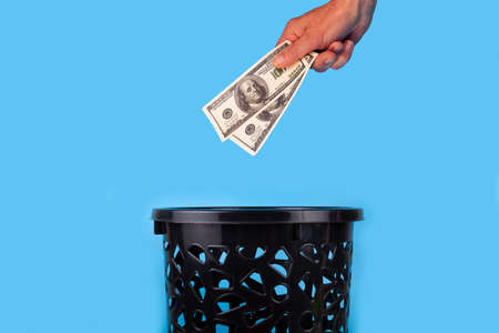 The hand throws money in the trash. A man is holding several Ukrainian hryvnia over the trash garbage can. Inflation, bankruptcy, obsolete money, concept. Bottom view.