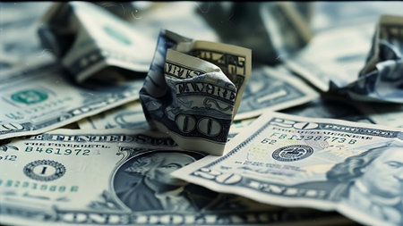 A dynamic arrangement of crumpled dollar bills creates an engaging visual representation of financial concepts, wealth, and economic activity.