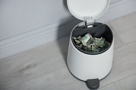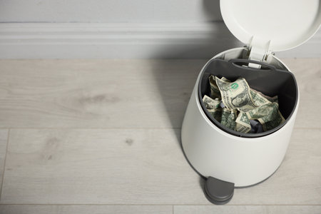 Dollar banknotes in trash bin on floor, above view. Space for text