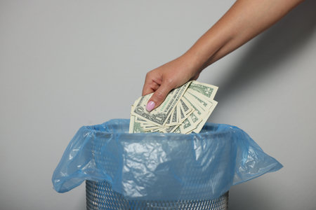Woman throwing dollar banknotes into trash bin near light wall indoors, closeup