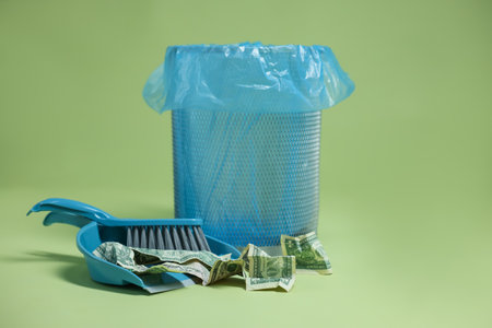 Dollar banknotes, dustpan, broom and trash bin on green background