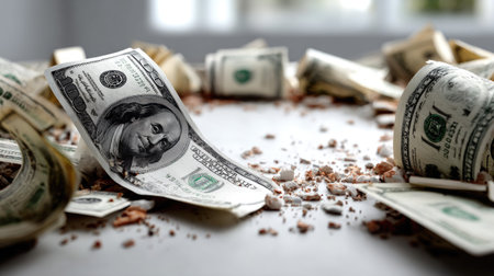 Close-up view of US dollar bills scattered on a white table alongside crushed candy and coins, symbolizing spending, finance, and consumption in a creative manner.