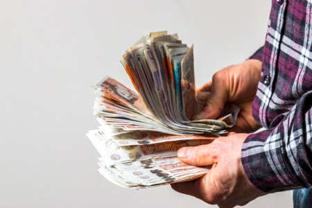 Crumpled banknotes of Russian rubles close-up on blurred background
