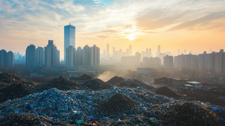 A striking contrast of a garbage pile foreground against a modern city skyline bathed in the soft light of sunrise, highlighting urban environmental challenges.