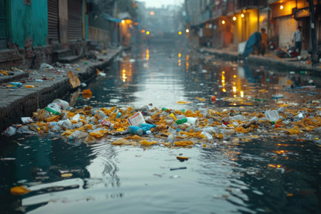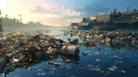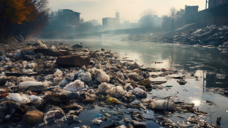 Extremely polluted defocused banks of river and huge amount of garbage. AI generative illustration.