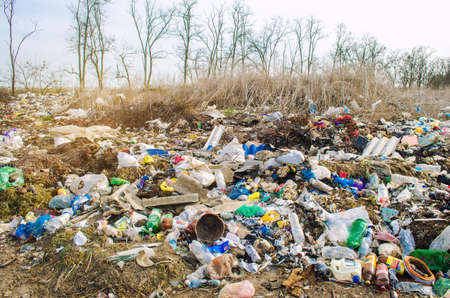 KHERSON, UKRAINE - MARCH 28, 2020: Heaps of garbage in the forest. Illegal garbage dump in nature. Environmental and air pollution. Trash ecological problem in not developed countries. Selective focus