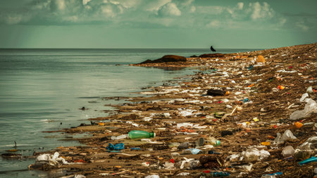 Plastic pollution littering a water shore