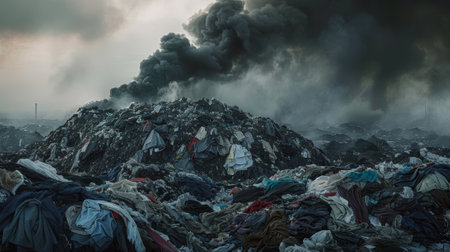 A mountain of trash is on fire, with smoke billowing into the sky. The scene is chaotic and overwhelming, with piles of clothes and other debris scattered everywhere. Scene is one of destruction