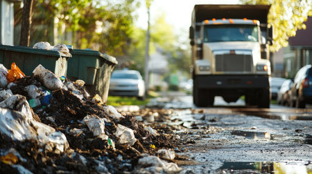 A garbage collection truck approaches a pile of rubbish on an urban street in the morning light. Litter and debris highlight the need for sanitation efforts in neighborhoods.