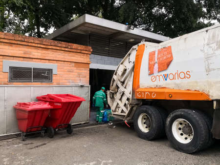 ISTANBUL, TURKEY - Sep 16, 2019: A garbage collection truck and bin man keeping the streets clean. Waste management concept image.