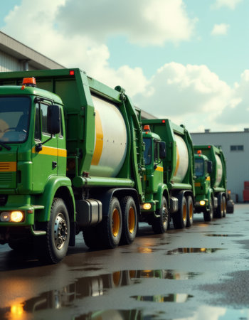A green garbage truck on a rainy day, its headlights reflecting off the wet pavement as it collects waste from curbside bins