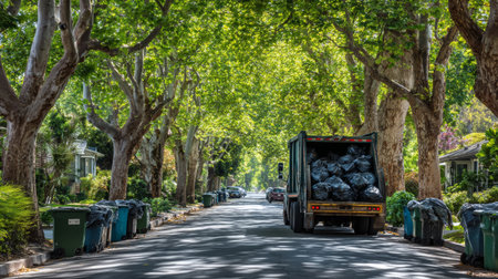 A garbage truck moves along a residential street with green trees, stopping to collect black rubbish bags. The vehicle is part of the waste collection service in the area.
