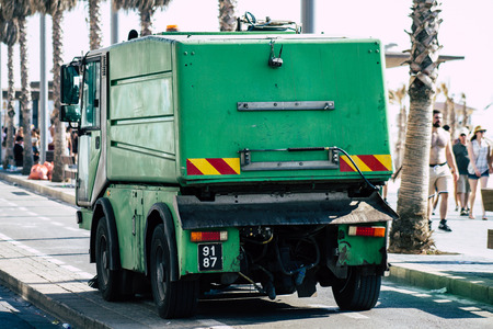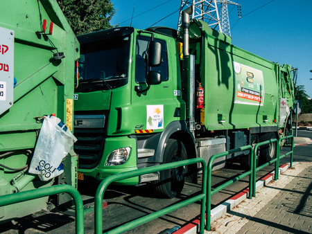 Tel Aviv Israel October 25, 2018 View of a green garbage truck parked in the streets of Tel Aviv in the afternoon